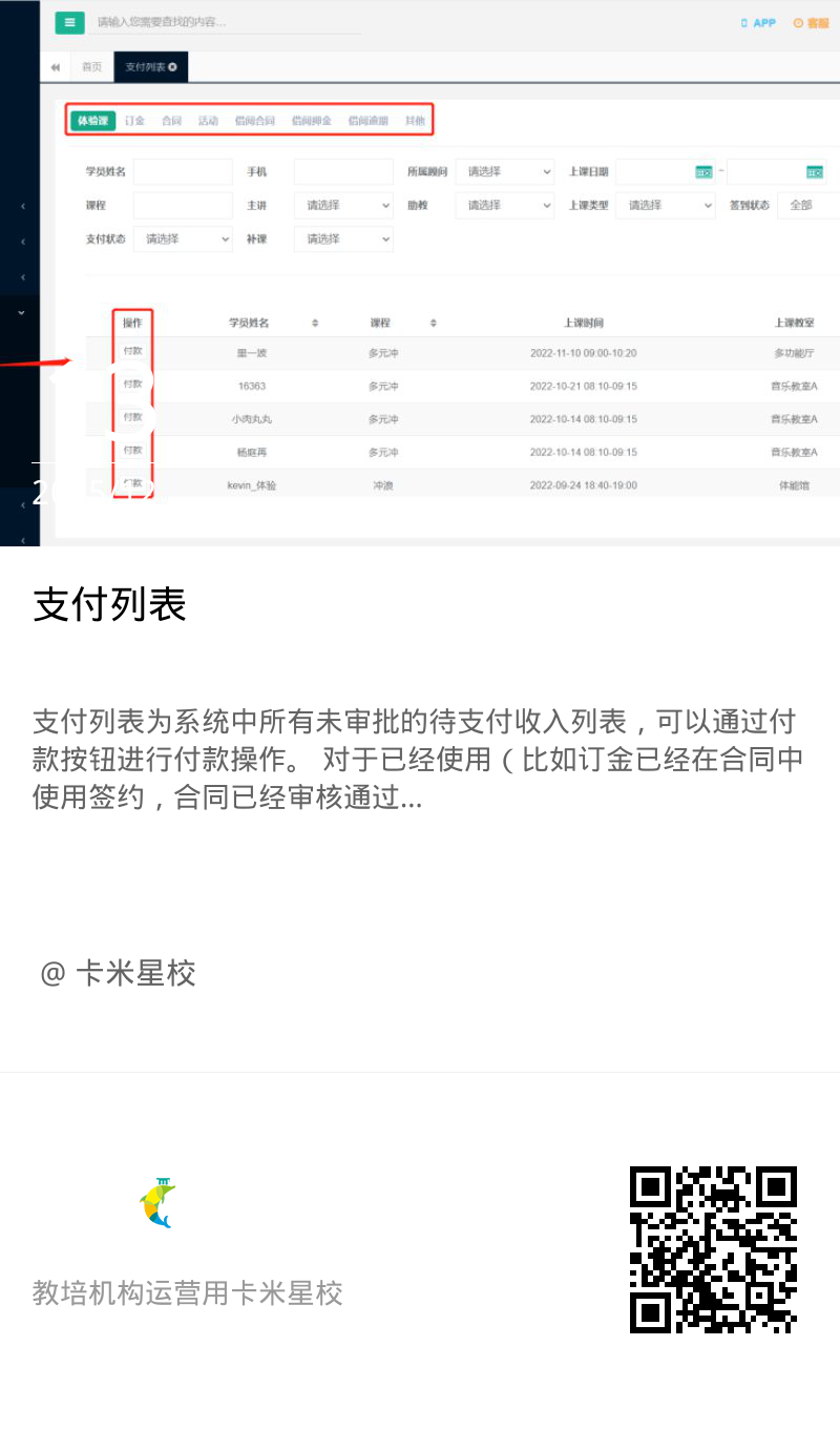 支付列表为系统中所有未审批的待支付收入列表,可以通过付款按钮进行付款操作。 对于已经使用(比如订金已经在合同中使用签约,合同已经审核通过)的费用则不能再进行支付,只能通过收支审批列表中的审批操作进行审批确认。 分享海报 点击下载海报 标签:流水账支付列表 扫描二维码,查看本文内容:支付列表 卡米星校是云端部署的教育培训机构运营管理系统。卡米星校致力于技术和教育的结合,为各类教育培训机构提供更优质的招生推广、排课教学、课时管理等功能,支持家校互联、高级功能定向定制、小程序、App定制,为提高教育从业者的工作效率不懈努力,为教育培训机构品牌打造运营闭环。