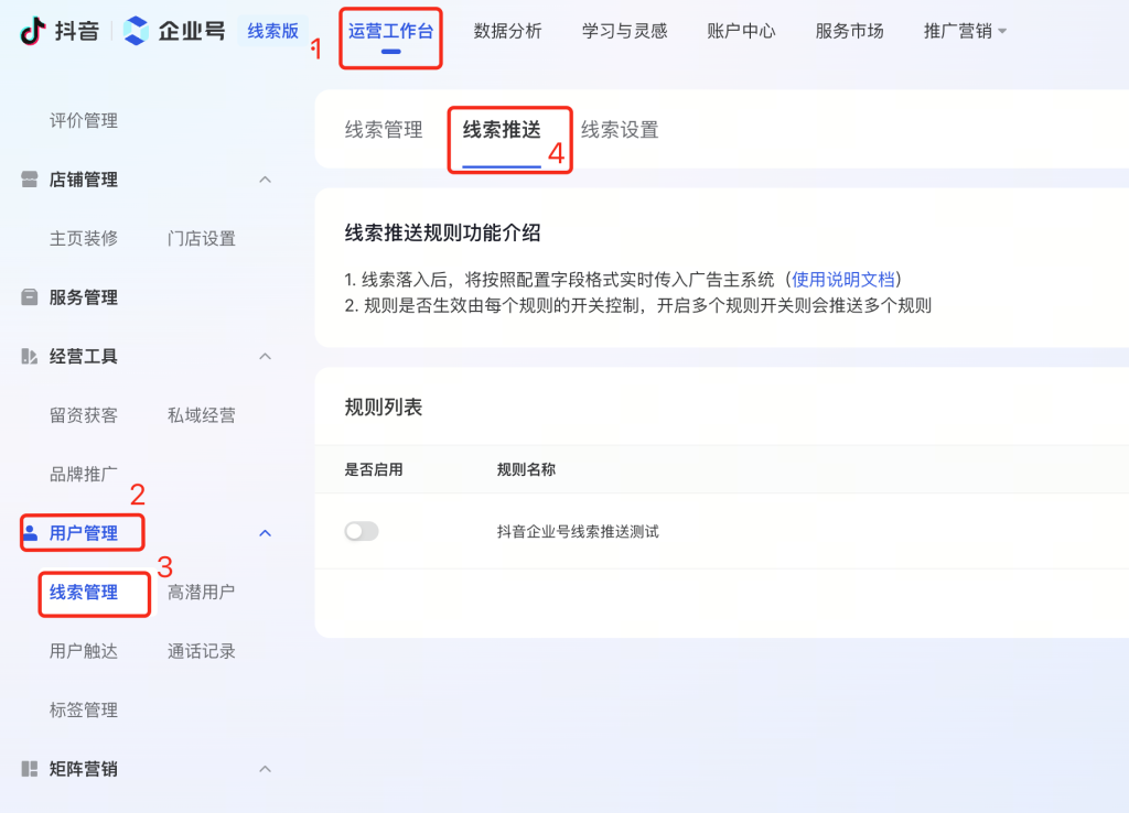 1、进入抖音企业号商家管理后台 (douyin.com),,找到运营工作台-用户管理-线索管理-线索推送