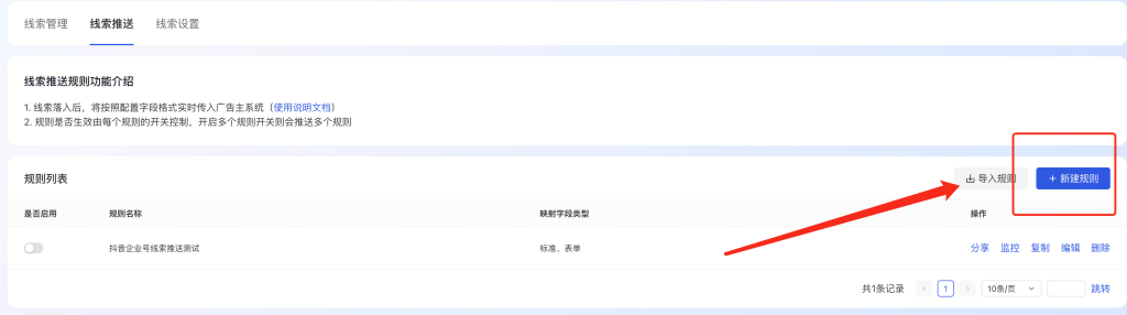 (如果您的抖音企业号后台看不到此功能,请咨询您的抖音对接人开通 抖音企业号线索版。若确实开不了线索版,可以尝试在飞鱼上配置规则测试,具体结果以实际情况为准。)
