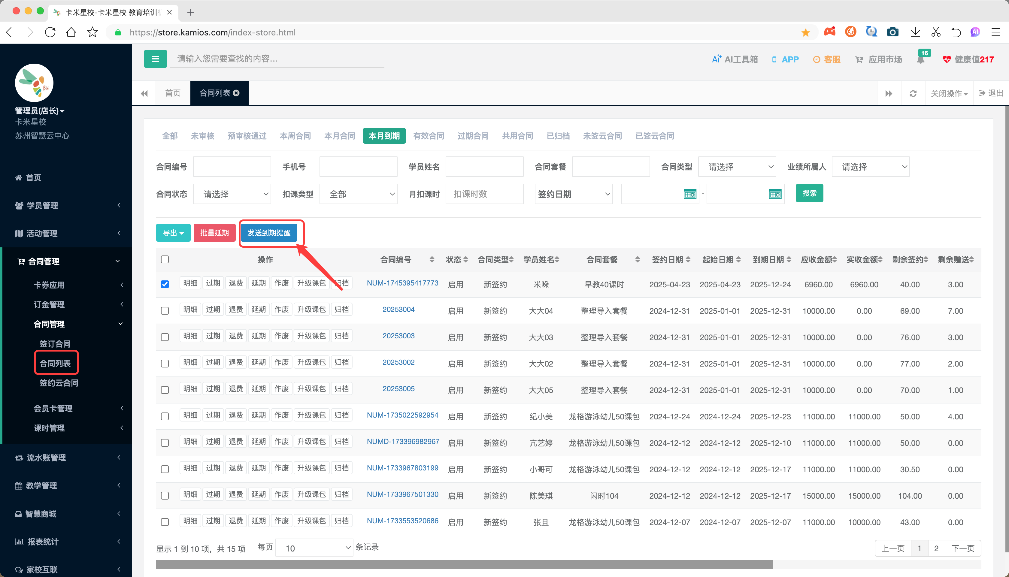 除设置自动触发外,给学员发送短信的入口路径: