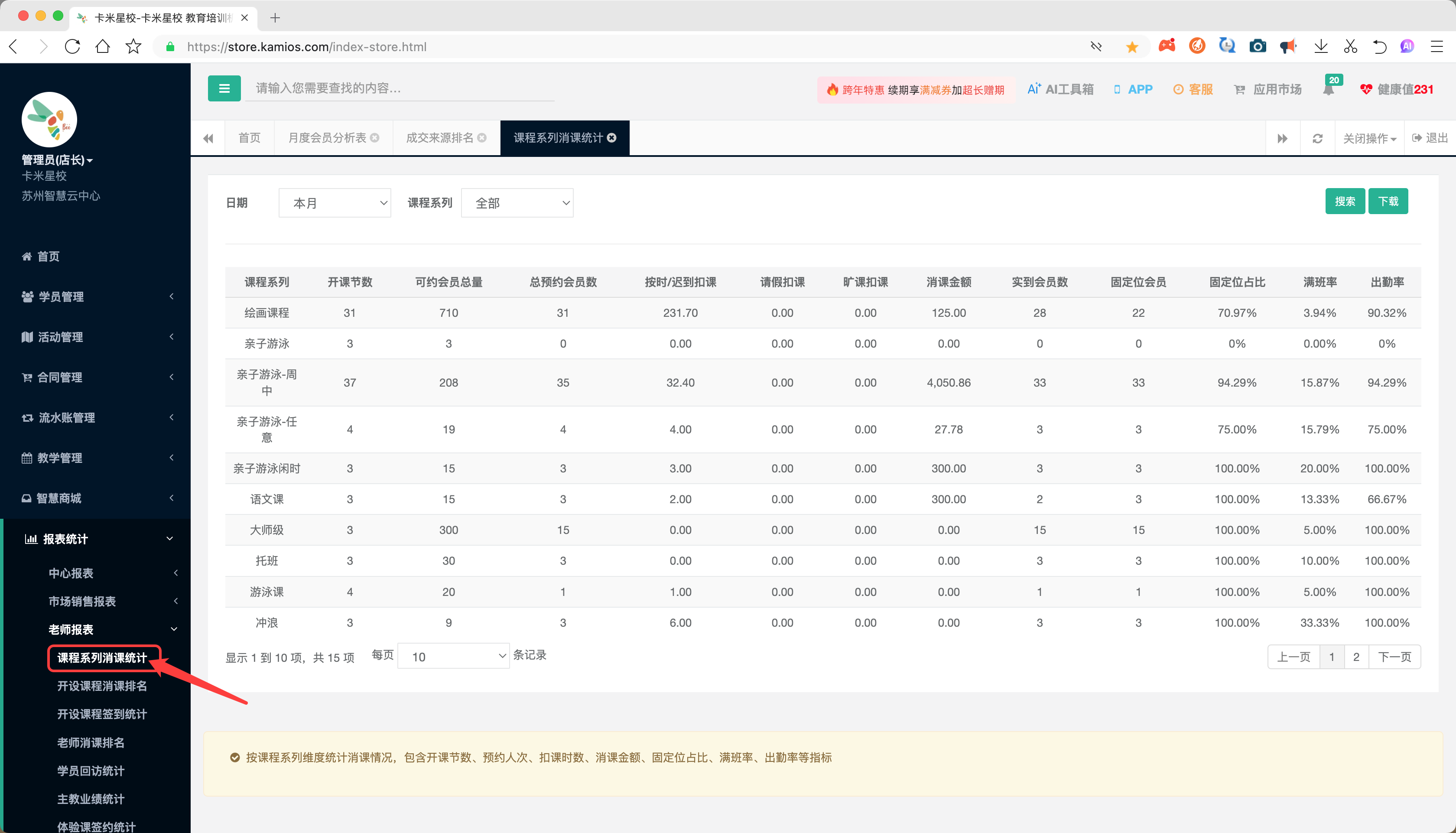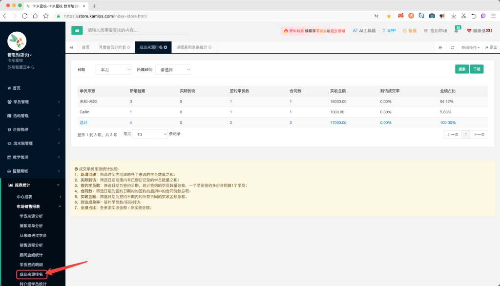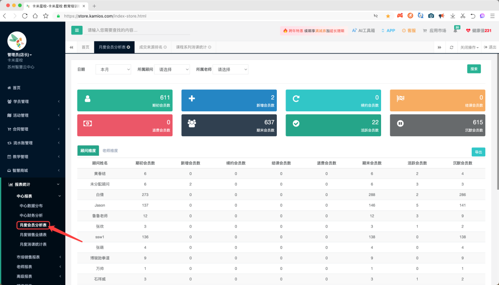 在教育培训机构的日常运营中,数据驱动的决策已成为提升管理效率和业绩增长的核心。卡米星校系统通过月度会员分析、成交来源分析和课程系列消课统计三张关键报表,为机构管理者提供了从“管学员”到“管市场”再到“管教学”的完整数据闭环。下面我们将系统解析如何通过这三张报表全面掌握机构运营状态。